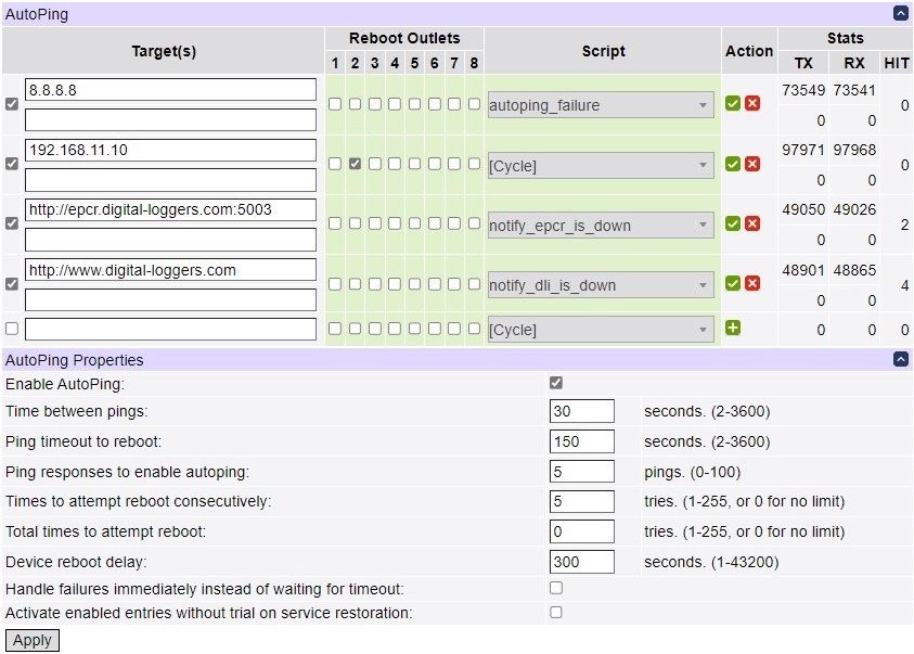 Auto-PingTM is an automatic system for rebooting IP equipment without human intervention. Auto-Ping works by cycling power when a device becomes unresponsive to IP pings. This page describes specific AutoPing features for products with WiFi. If you have a non-WiFi power controller, click here. To use Auto-Ping, first add an IP address. Next, link that IP address to one or more outlets. Timing settings can be tuned to your application.
