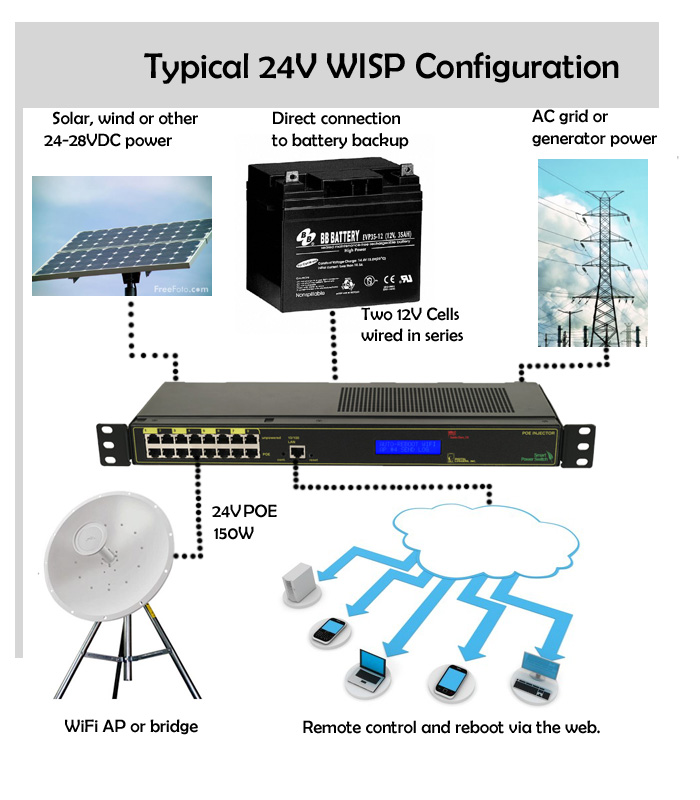 Eliminate POE problems. Restart WiFi APs and links automatically. Improve customer service and satisfaction. This regulated 8-port 24 volt POE midspan injector is built specifically for Ubiquiti, Alfa, Tranzeo, MikroTik, EnGenius and similar radios and IP cams that require clean, well regulated 24V POE.